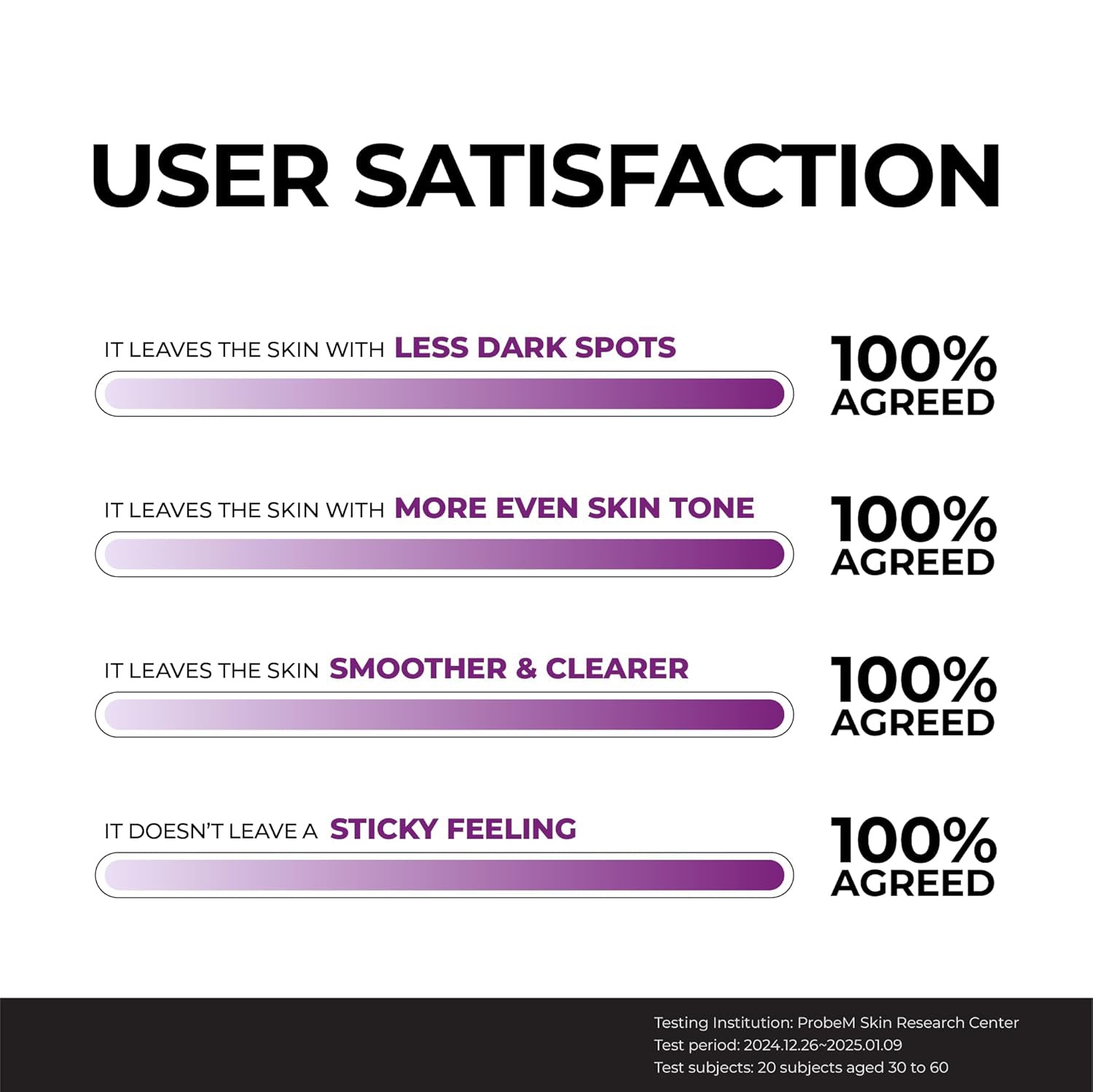 Dermatologically tested formula delivers -27.7% reduction in hyperpigmentation and -20% in redness after 2 weeks. 100% user satisfaction with smoother, clearer skin and more even skin tone.